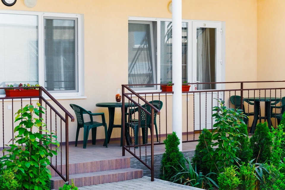 Номера категории "Стандарт" - рассчитаны для 2-4 человек. Имеют 2 основных и 1 или 2 дополнительных места. Площадь номера 18 м. кв. Выйдя из номера Вы попадете на личный балкон или террасу с мебелью для летнего отдыха на воздухе. Вид из номера в уютный двор отеля.
